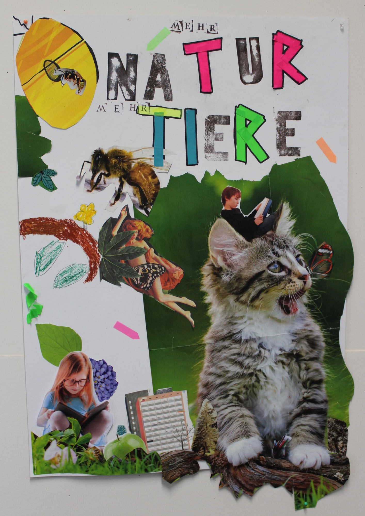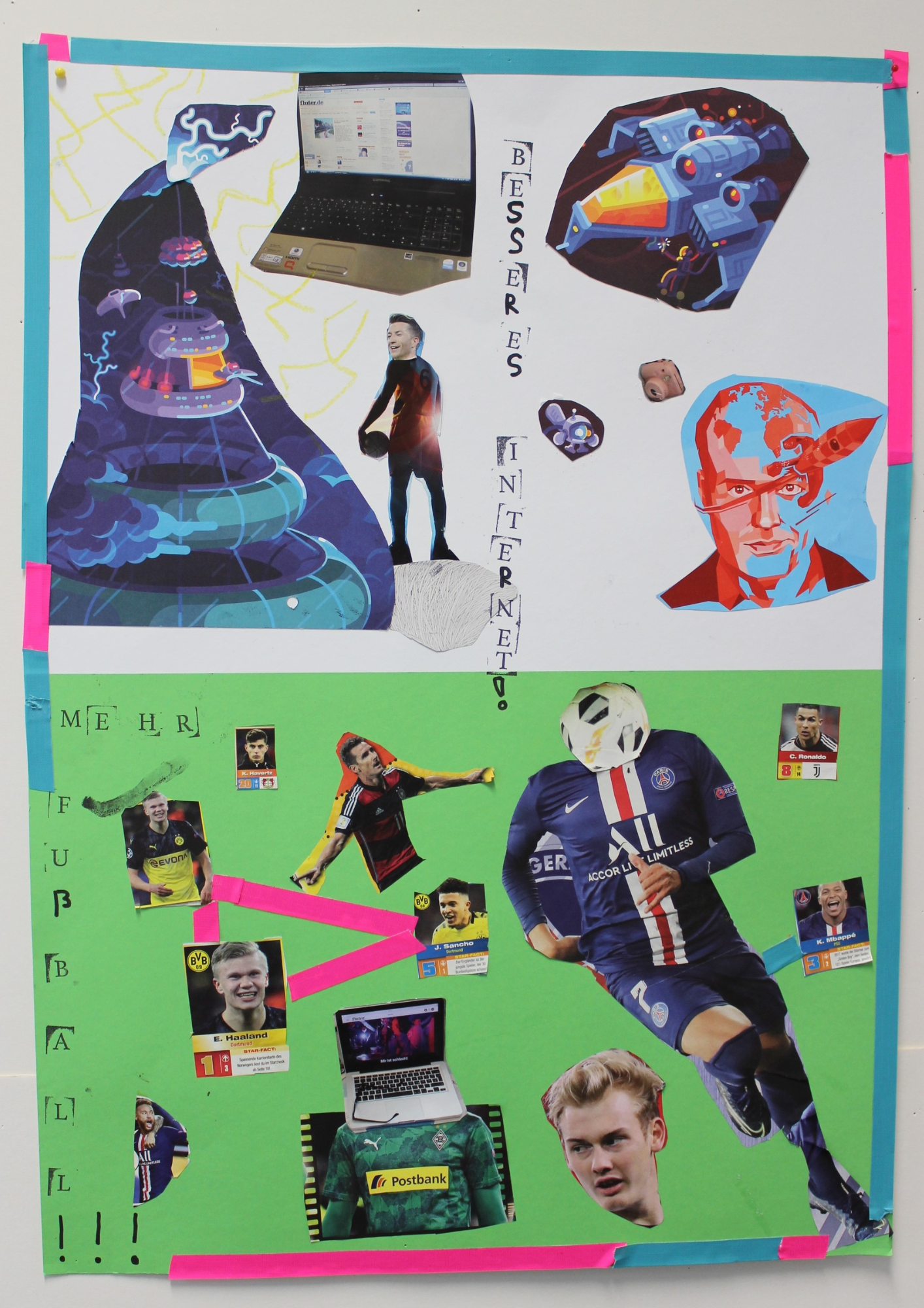 Im Rahmen des Workshops Collage haben die Kinder aus der 3. und 4. Klasse beim Schüler:innen-Kongress So sieht’s aus: Unser Blick auf Ganztagsschule! den eigenen Blick auf ihre Ganztagsschule in großen farbigen Collagen visualisiert. Dabei sind diese zwei Plakate zum Thema „Interessen nachgehen“ entstanden.